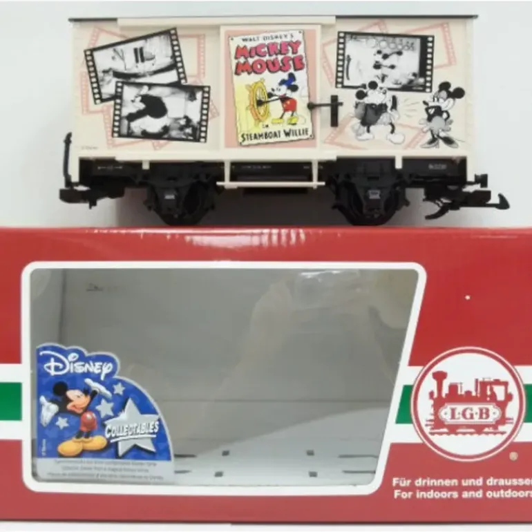 Here is a LGB 44358 G Scale Disney Steamboat Willie Disney Mickey Mouse Boxcar. The artisans of Lehmann have honored the artisans of Disney with this unique and beautiful wagon. Borrowing from the early days of Disney, the car is covered with film “chips” from “Steamboat Willie,” the black-and-white short featuring Mickey Mouse, Disney’s most famous cartoon character. You’ll also find a color movie poster and a scene from the movie. Like the classic Disney cartoons, this LGB car is more than a model. It is a work of art. This car features a plastic construction with sliding doors, plastic wheels, and latch couplers.