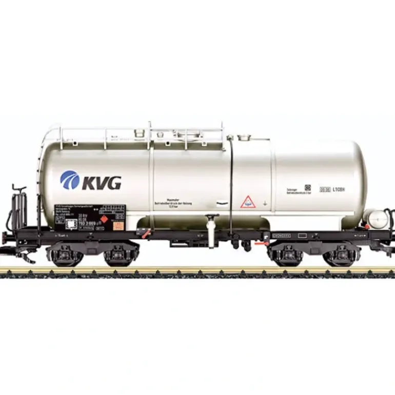 This is a four-axle tank car used on the German Federal Railroad (DB). It is a privately owned car painted and letterd for the Tank Car Leasing Company Hamburg (KVG). The filler hatch and the valve for emptying the car can be opened. Length over the buffers 48 cm.