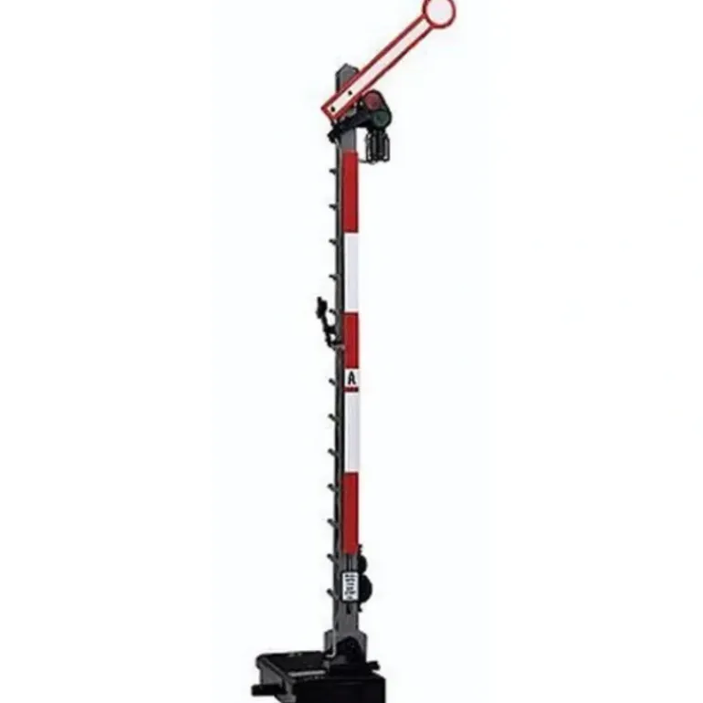This classic European Home Signal can be found in many railways. The electrically activated LGB signal is equipped with a moveable signal arm and signal lights. The mast is finely detailed and equipped with moveable levers and counterweights. It is 350mm high.