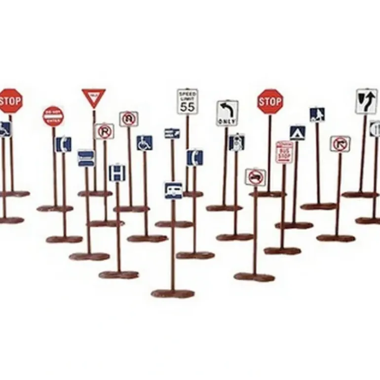 This detailed set of signs will finish off your streets and highways for added realism. Signs are appropriately colored molded plastic.