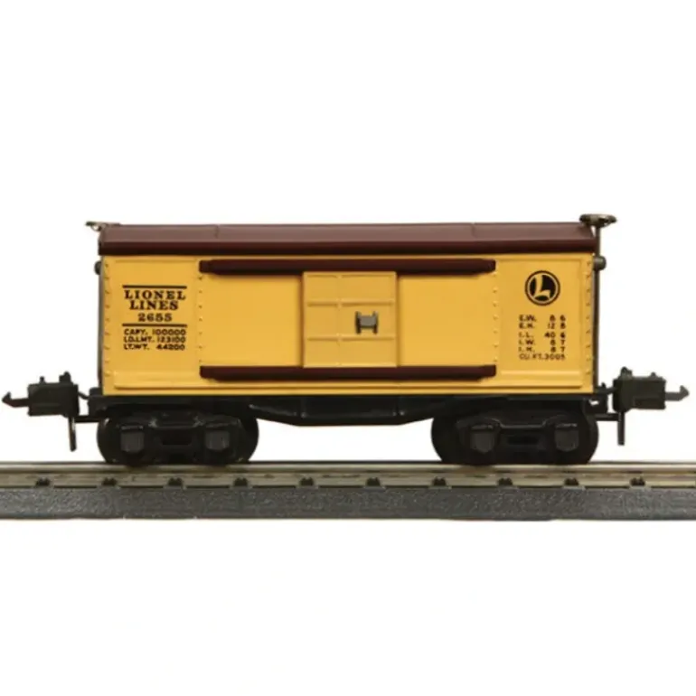 This is made by MTH and is part of the new “Lionel Corporation Tinplate” Line. Originally catalogued in 1941 this 2655 O gauge box car came equipped electric remote control couplers. Catalog numbers, initially in the 600 series, were changed to the 2600 series when new automatic couplers were added in 1938. Part of the 2600 rubber stamped freight car series from M.T.H., this car features baked enamel finishing, stamped steel body and chassis, metal wheels and axels, and operating metal latch couplers. “In designing this marvelous new series of Lionel ‘O’ Gauge Freight Cars, our aim has been to express the individuality of every type of commercial freight car used on all railroads. Many new features never before carried out to such perfection are apparent in these cars.”