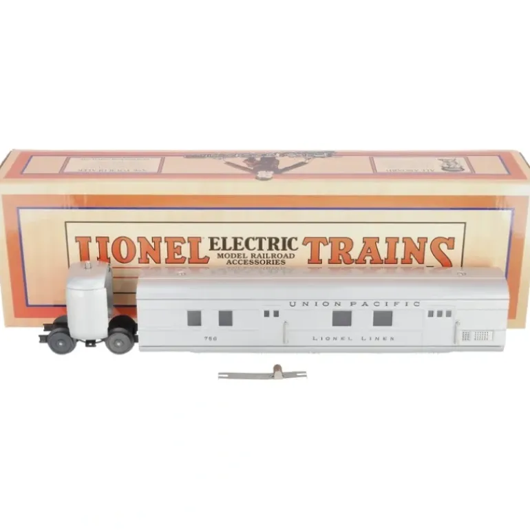 This is made by MTH and is part of the new “Lionel Corporation Tinplate” Line. This is an MTH 11-80002 Streamlined Articulated Union Pacific Baggage Car. It features a stamped steel body and chassis, metal wheels and axles, die-cast 4 wheel trucks, end of car diaphragms, operating interior lights, and it operates on O-72 curves.
