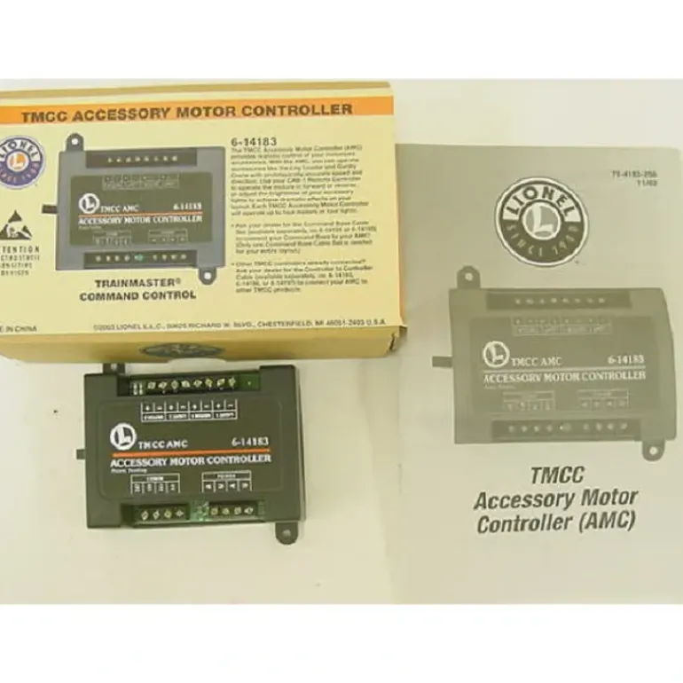 This is a Lionel 6-14183 TMCC Accessory Motor Controller – AMC. The Action Motor Controller (AMC) gives you control over your accessories like never before. When used in conjunction with lights, the AMC allows you to control bulb brightness from the CAB-1 Remote Controller. When used in conjunction with your accessorys motors, the AMC gives you control over operation. You can spin the cab on a gantry crane with the red knob, or raise and lower the boom with the CAB-1 Remote Controller buttons. Features include Precise motor and/or light control, Operation of accessory speed, direction, or function from the CAB-1 Remote Controller, Two modes allow you to take fine control of accessory motor functions (e.g., gantry crane cab rotates as you rotate CAB-1 Remote Controller knob in whichever direction you are turning OR accessory operates in its normal way as long as you give it the command to operate), Programmable accessory motor speed or light intensity, Operates up to four motors or up to four lights.