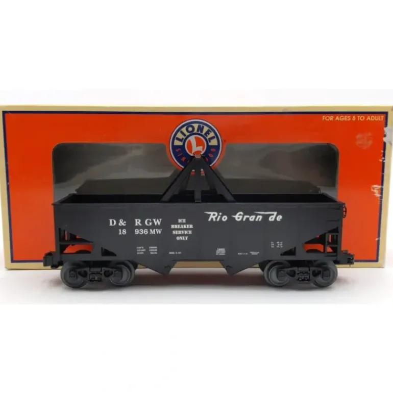 Here is a Lionel 6-16463 O Rio Grande Ice Breaker Tunnel Car #18963. Ice breaker cars are hoppers modified to break up large pieces of ice in tunnels. This car features die-cast metal sprung trucks, die-cast metal operating knuckle couplers, and metal wheels and axles.