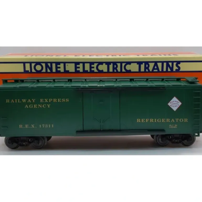 Here is a Lionel 6-17311 O Gauge Railway Express Agency Refrigerator Car #17311. This Railway Express Agency reefer car is scale length and features sliding doors, die-cast metal sprung trucks, die-cast metal operating knuckle couplers, and metal wheels and axles. It measures approximately 10 1/2″ long.