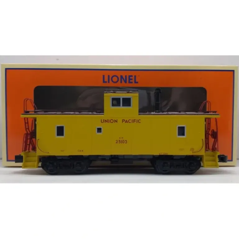 This is a Lionel 6-17691 Union Pacific CA-4 Illuminated Caboose, #25103. Between 1942 and 1975, 750 steel cabooses were delivered to the Union Pacific. Easily identified by a tall cupola centered on the roof, these Union Pacific CA-class cabooses are one of the most recognizable caboose types in North America. The CA-4 class, built at Pullman Standards Michigan City plant in 1944, featured riveted body panels, Murphy roof panels, a small lavatory window, and Q-style trucks when first delivered. The general design and basic features of the unique high-cupola caboose of Union Pacific, however, remained unchanged for over 30 years. This car features Die-cast metal sprung trucks for improved tracking, especially through switches, Operating couplers uncouple cars, automatically with a remote-control or uncoupling track section, Scale proportions, Super-detailed with many separately-applied metal parts, Prototypical paint schemes, Minimum Curve: O-31 (Except where noted), Perfectly sized to match Lionel Standard O Locomotives, All-new tooling, New die-cast metal sprung Q-type trucks, Hidden uncoupling tabs, Separately applied metal underframe details, Smoke unit with ON/OFF control, Train crew figures, Detailed and painted interior, Opening doors, Exterior end lights, the minimum diameter is O-31 and it is 10 inches long.