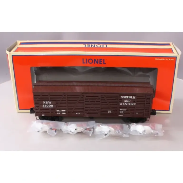 Here we have a Lionel 6-17712 O Gauge Norfolk & Western ACF 40-Ton Stock Car #33000. This car features opening doors, four cow figures, die-cast metal sprung trucks, die-cast metal operating knuckle couplers, metal wheels and axles.