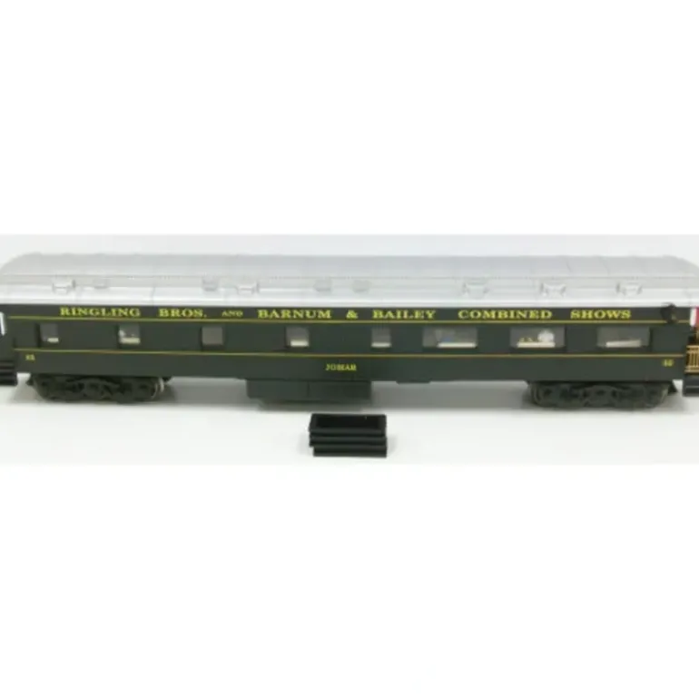 This is a K-Line by Lionel 6-22225 O Ringling Bros. Jomar 18 Heavyweight Private Car #32. John Ringlings private car, JOMAR – named for he and his wife, John and Mable Ringling – was a fixture for decades. It joined the train in the early 1920s, reputedly as the only green car in the consist. Later it was inherited and used by his nephew, John Ringling North, and even had a cameo appearance in Cecil B. DeMilles 1952 epic film, The Greatest Show on Earth. Dimensions: Length 18.