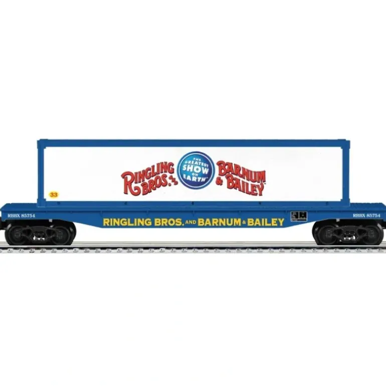 This is a Lionel 6-22417 O Ringling Bros. Flatcar with Container. Dimensions: 13.5 Length.