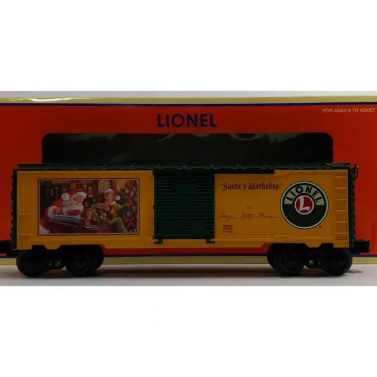 Here is a Lionel 6-25034 O Gauge Angela Trotta Thomas Santa’s Workshop Boxcar. Features include die-cast metal sprung trucks and operating couplers, metal frame, and opening doors. The minimum curve radius is O-27 and length measures 10 1/2 inches long. This car was built in 2007.