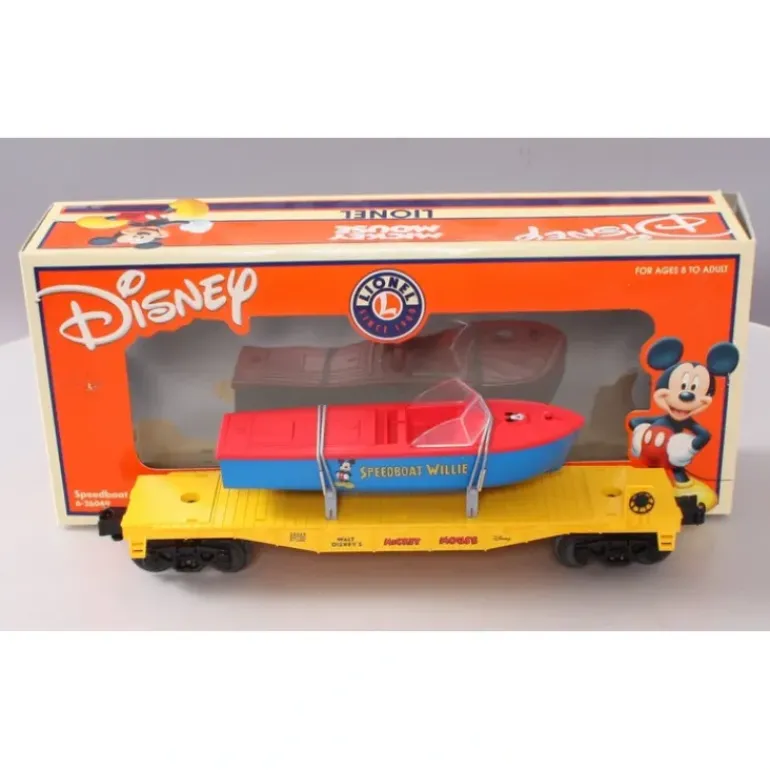 Here is a Lionel 6-26049 Disney Flat w/Speedboat Willie Boat. The boat is removable and floats. This car features plastic trucks, operating knuckle couplers, metal wheels and axles.