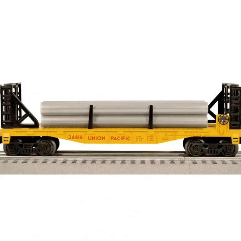 Here is a Lionel 6-26616 O Gauge Union Pacific Bulkhead Flatcar with Pipes. This car features a plastic construction with die-cast metal sprung trucks, metal wheels, operating knuckle couplers, and a removable pipe load.
