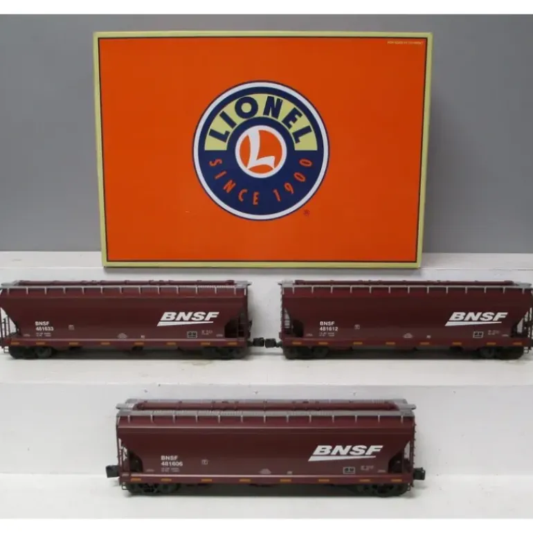 This is a Lionel 6-27189 BNSF 3-Bay 3-Car ACF Hopper Set from 2008. With its distinctive angular nose, wide cab, flat-sided fuel tanks, and wide cooling air intake wings, the SD70ACe locomotive was noticeably different from previous SD70 diesels. It was also more environmentally friendly, having been updated to meet new EPA regulations for railroad locomotives. There were a handful of original buyers of this impressive diesel locomotive, including Burlington Northern Santa Fe, Kansas City Southern, and Ferromex. For 2008, Lionel offers the Standard O SD70ACe in these three roadnames. BNSF SD70ACe is decorated in the new Heritage III orange and yellow paint scheme, featuring the companys newest swoosh logo on the sides and nose. The Kansas City Southern SD70ACe captures the railroads recent switch on many of its locomotives to yellow, red, and brunswick green_a paint scheme that once adorned its famous Southern Belle passengers cars. Ferromex, or Mexican Railroad, is one of the countrys largest railroad systems, which interconnects major Mexican cities including ones that border the United States. The Ferromex SD70ACe by Lionel is handsomely adorned in green, red, and white–the colors of the Mexican flag. Features include Hidden uncoupling tabs, Rotating bearing caps, Extruded aluminum body, Opening roof hatches on DM&IR, Each car is individually boxed and Die-cast metal ends. This set measures 11 1/4 inches long and the minimum curve radius is O-36.