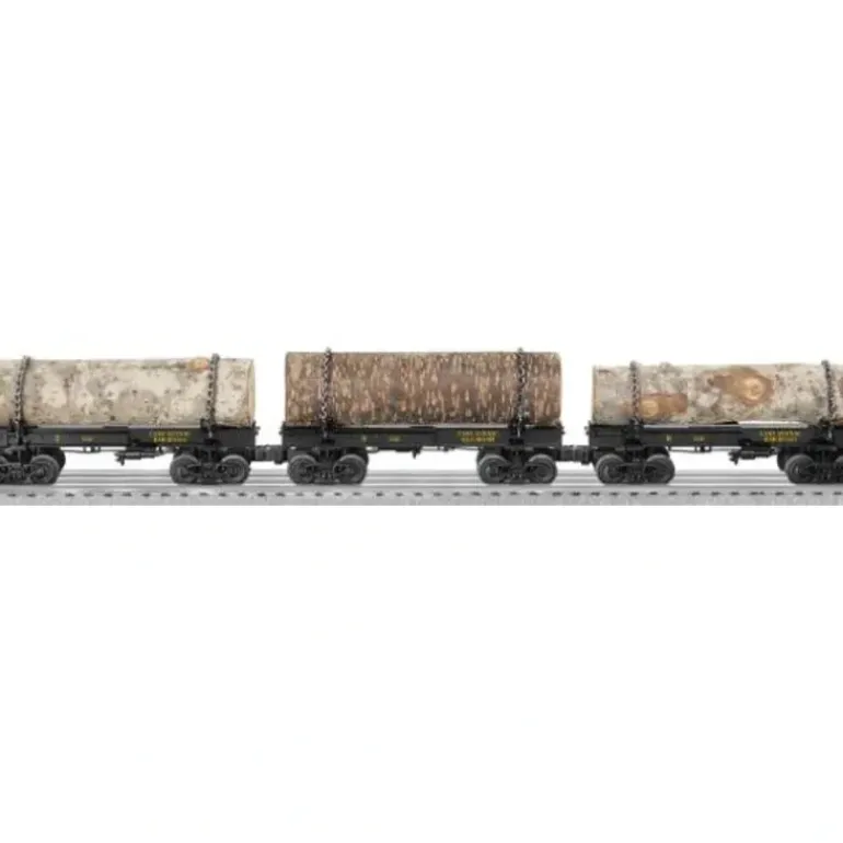 This 3 car set includes die-cast metal bodies, authentically detailed brake rigging and air cylinder, removable realistic simulated wood log attached to each car with two metal chains, and a unique road number on each car. These cars are Standard O gauge. The length of a single car is 9 inches and the length of all three cars is 27 inches. The minimum curve radius is O-27.