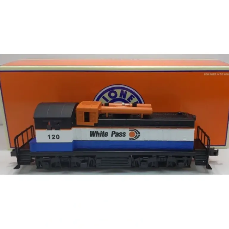 This is a Lionel 6-28594 O Gauge White Pass & Yukon NW-2 Diesel Switcher #120. This locomotive features Transformer controlled forward, neutral, and reverse operation, Directional lighting, Electronic diesel horn and bell, Die-cast metal trucks, Operating couplers, Pullmor motor, and a Metal frame.