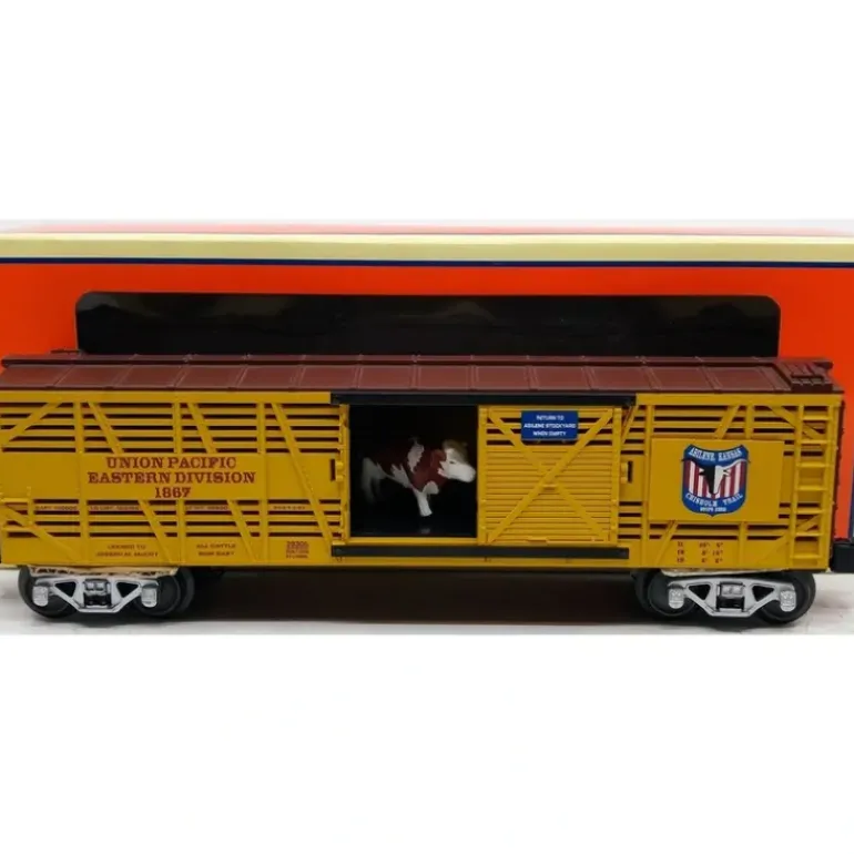 Here is a Lionel 6-29305 O Gauge Joseph McCoy “Chisholm Trail” Stock Car w/Sounds #1867. Follow the famous cattle trail north through dusty Texas and Oklahoma to Abilene, Kansas. Abilene is the destination point for all Chisholm Trail cattle, the largest stockyard in the Midwest owned by Joseph G. McCoy. Here the cattle herds are loaded onto trains and shipped on the Union Pacific Eastern Division railroad to the growing northeastern cities. The end of the trail stops here with this new operating stock car. Now you can hear the sounds of the cattle inside the stock car respond in unique fashion to the various movements of your freight train. Listen to a variety of mooing sounds coming from the cantankerous cows inside sounds that are uniquely triggered from motion sensors in your operating stock car. Youll also hear realistic sounds of the freight car itself as it brakes and scrapes its way down the rails, and even sounds of the cowboy workers. With a LEGACY CAB-2 remote controller, you can activate sounds yourself (and even create your own customized Quilling Cow!). Take realism and fun to the next level with this new operating stock car.