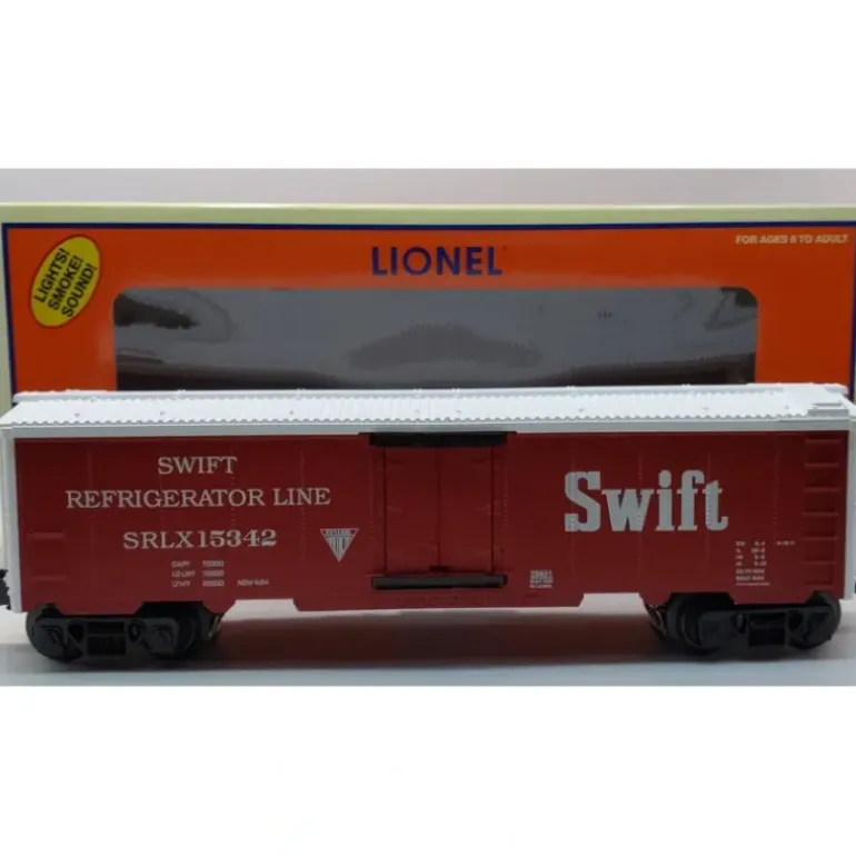 Here is a Lionel 6-29831 O Gauge Swift Hot Box Reefer. When a wheel bearing overheats it causes the brakemans nightmare known as a hot box. These new cars allow you to recreate this red hot situation. The scenario begins with an irregular sound and a whiff of smoke. Crew dialog keeps you on top of the situation with reports such as Somethings burning! And Weve got a blazer! Smoke, lights and screeching intensify until you, the engineer, initiate an emergency stop to let your crew cool that spindle. Features include Flickering lights, smoke, screeching and crew dialog of a hot box emergency, die-cast metal trucks, operating couplers and an ON/OFF switch. This reefer operates on both Command Control and Conventional layouts.