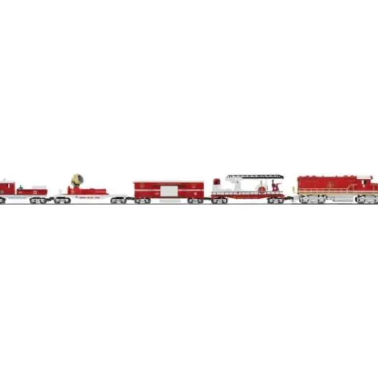 Be a hero and save the day on your Lionel layout! Assist anyone in need of emergency help with your American Fire & Rescue Set made up of a variety of rescue cars, each with its own special duties. This colorful, eye-catching set features high gloss fire truck red decoration on each car including the powerful GP-20 diesel leading the way. Behind this rugged conventional Geep are four special emergency unit cars, a fire and rescue searchlight car to spotlight trouble, a fireman and ladder car for putting out fires and making daring high-rise rescues, an emergency command unit car with siren and command unit sounds, and a first aid caboose to tend to the injured. This set comes complete with a powerful CW-80 Transformer and 12 sections of FasTrack track. Available separately is a matching add-on American Fire & Rescue Water Tank Car. Features Set Includes: GP-20 diesel locomotive, fireman and ladder car, emergency command unit car, searchlight car, first aid caboose, eight curved FasTrack sections, three straight FasTrack sections, one FasTrack terminal section, CW-80 Transformer, smoke fluid Locomotive Features: Transformer controlled forward, neutral, and reverse operation Electronic diesel horn Operating headlights Front and rear operating couplers Powerful maintenance-free motors Traction tires Interior illumination Engineer and fireman figures Metal frame and handrails Rolling Stock Features: Die-cast metal trucks and operating couplers Fireman and ladder car includes two metal ladders, three vertical nozzles, and oscillating fireman Command unit car features emergency siren and sounds operated by 9 volt battery (not included) and opening doors Searchlight car features illuminated light with manually adjustable light position First aid caboose features strobe light, interior illumination, removable stretchers and oxygen tank, figure Gauge: Traditional O Gauge Dimensions: Length: Approx. 56 Layout dimensions: 40 x 60 Minimum Curve: O-27