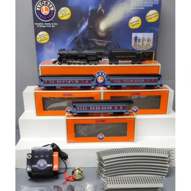 Here is a Lionel 6-31960 O The Polar Express Steam Locomotive Set. Features include transformer controlled forward, neutral and reverse operation, air whistle in tender, operating headlight, operating coupler on rear of tender, a powerful maintenance-free motor, 2 traction tires, puffing smoke, and a die-cast metal locomotive body and frame. Passenger cars feature interior lighting, decorated drumhead on observation car, all-new, rounded observation platform and silhouettes in windows. Also included in 40×60 oval FasTrack. With 8 curved sections, 6 straight sections.