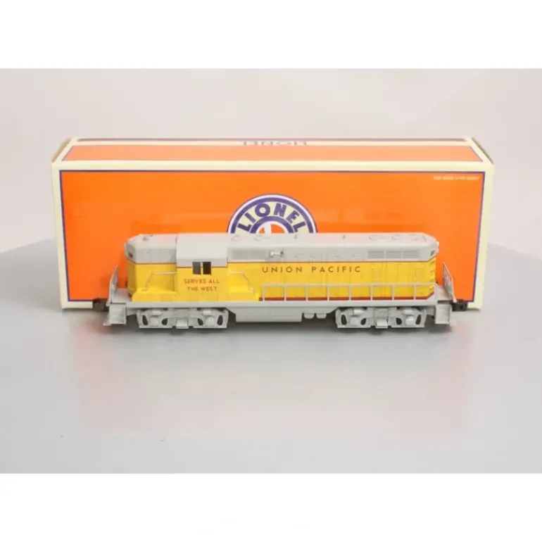 Here is a Lionel 6-38351 O Gauge Union Pacific GP-7 Diesel Engine #1038 from the Archive Collection. Shown in the 1955 advance catalog as #2028 but never produced, an early toy fair prototype was made by Lionel as #1038. This engine features a plastic body construction with a metal chassis, transformer controlled forward, neutral, and reverse operation, pullmor motor, directional headlights on both ends, electronic diesel horn and bell, die-cast metal trucks ,pilot, and fuel tank, Magne-Traction, tractions tires, illuminated cab interior, and operating knuckle couplers.