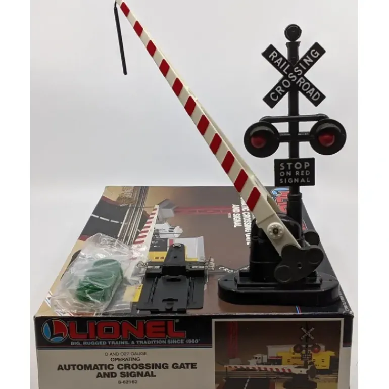 This is a Lionel 6-62162 O Operating Crossing Gate & Signal. When a train passes over the 153C contactor the Crossing Gate drops and the lights illuminate. The 153C Contactor is included. It also works with an insulated track section which is sold separately. It measures 8 inches tall.