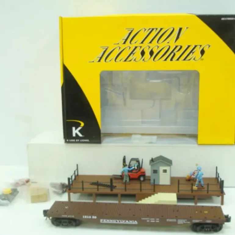 This is a K-Line by Lionel 21449 Operating Loading Platform w/Car. When the flatcar arrives the work crew springs into action. Features a scale flatcar, moving figures, moving forklift, and measures 13 inches x 5.5 inches.