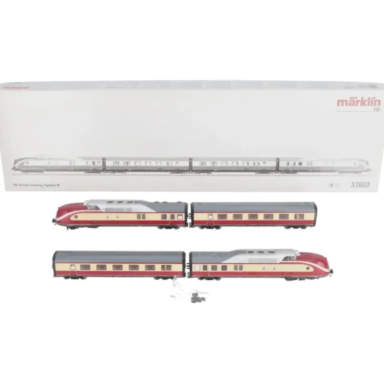 Model: This is a 4 unit train. It has an mfx digital decoder and extensive sound functions. Each powered end car has controlled high efficiency propulsion. 1 truck powered on both axles powered for each powered end car. Traction tires. The train has factory-installed interior lighting. The triple headlights and dual red marker lights change over with the direction of travel, will work in conventional operation, and can be controlled digitally. The interior lighting and the headlights are maintenance-free warm white LEDs. The power is picked up in the front powered end car, depending on the direction of travel. There are special multi-conductor current-conducting couplings and tightly fitting diaphragms with guide mechanisms between the cars. A reproduction of the closed Scharfenberg coupler (non-working) is at both ends of the train. Train length over the couplers 88 cm / 34-5/8″.