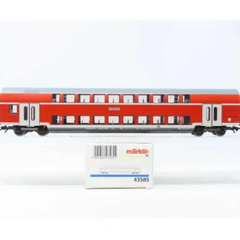Here is a Marklin 43585 HO Scale DB 2nd Class Bilevel Car. The car is ready for installation of 7319 current-conducting couplings or 72020/72021 current-conducting couplers. Length over the buffers 26.8 cm / 10-9/16. DC wheel set 4 x 700580. It is not lighted.