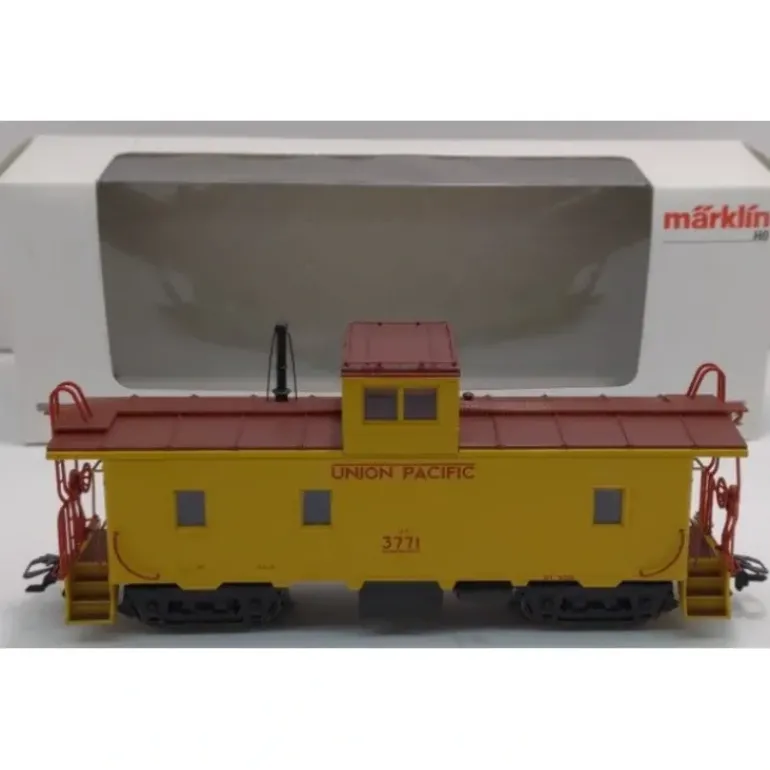 This is a Marklin 45702 HO Scale Union Pacific Caboose #3771. This caboose features a die-cast metal frame and floor, detailed trucks with special wheel sets, platforms at both ends with hand brakes, the roof walk, ladders and other details are separately applied, and the couplers can be replaced with other makes of couplers. The length over the couplers measures 5-9/16. DC wheel sets 4 x 32 0552 (NEM)m 4 x 32 0389 (RP25). This caboose goes well with these Union Pacific (UP) locomotives: the 37991 Big Boy locomotive, the 37973 class 2400 Mikado, and the 37610+49610 class 600 ALCO PA-1 double unit locomotive.
