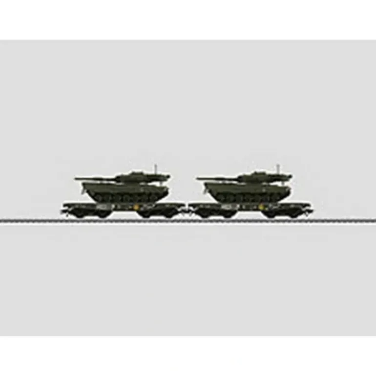 The car frames are constructed of metal. Total length over the buffers 49.6 cm / 19-1/2. Load restraints included. The metal models of the military vehicle have detailed underbodies, superstructures, and chain assemblies constructed of metal. Other components are made of detailed plastic parts. The turret and the cannon can be turned and raised/lowered. The armored vehicles have separately applied details. They also have an authentic paint scheme. They are lettered with different markings. Length approximately 8.9 cm / 3-1/2, with the cannon approximately 11.0 cm / 4-5/16. Metal superstructure. Detailed construction. Authentic paint scheme. Fine lettering.