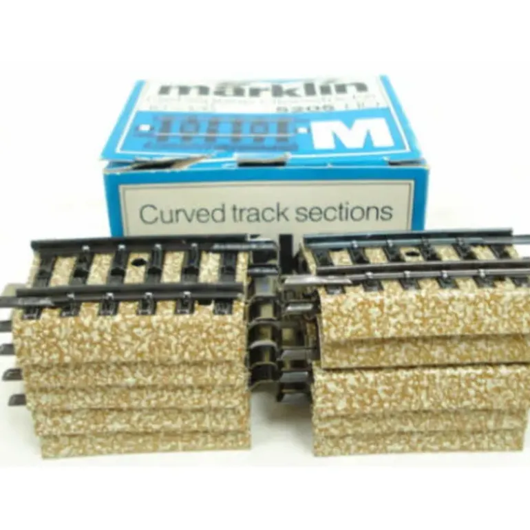 Here is a box of Marklin 5205 Ten Curved Track Sections. They feature metal construction and measure approximately 2 inches in length.