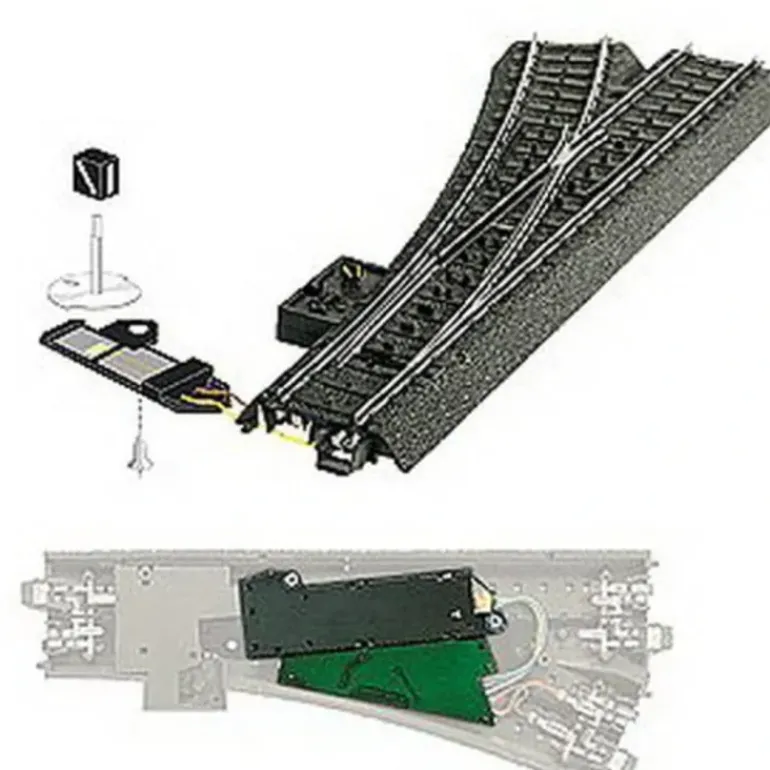 Digital turnout mechanism set with a turnout lantern for installation in a left or right C Track turnout, item nos. 24611, 24612, 24711, 24712, 24671, or 24672. The set consists of a turnout mechanism, turnout decoder, turnout lantern, and installation instructions. This set is not designed for use with the 24630 three-way turnout.