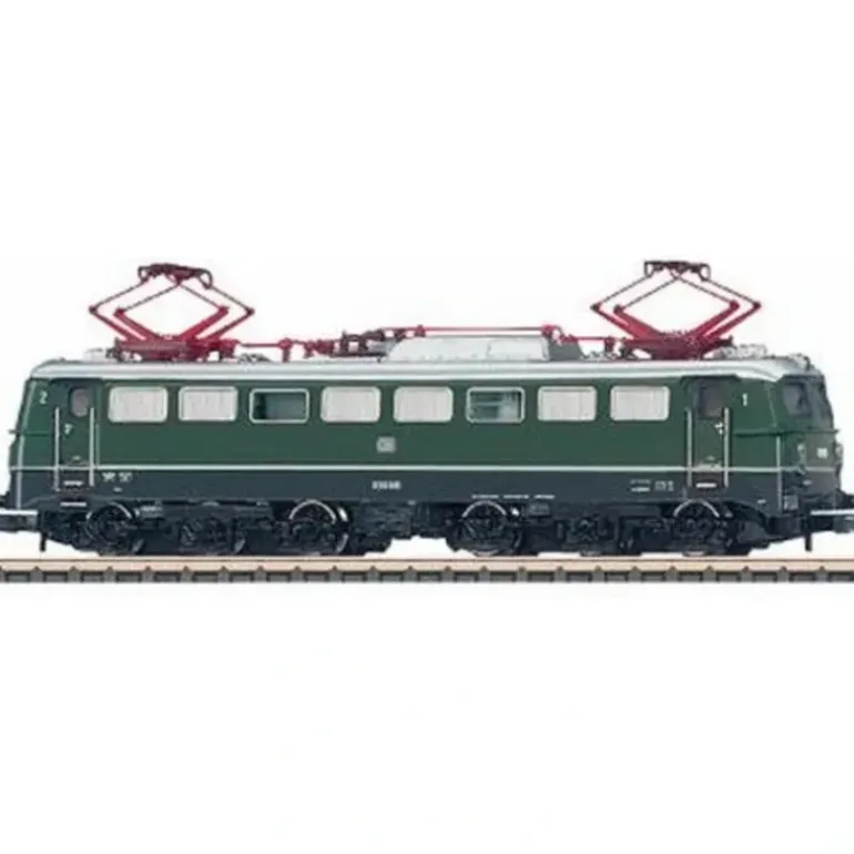 Here is a Marklin 88575 Z German Federal RR DB Class E 50 Freight Electric Locomotive. The locomotive looks as it originally did around 1960. Model: Both trucks powered. The wheel treads are dark nickel plated. Length over the buffers 88 mm / 3-7/16. Other features include plastic construction, fishhook couplers, metal wheels & axles, two operating pantographs, and a motor.