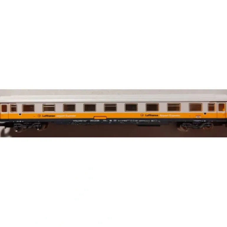 Here is a Marklin Z Scale Lufthansa Airport Express Passenger Car. This passenger car features a durable plastic body construction with intricate detailing, metal wheels and axles, and fish-hook style couplers. This car is not lighted.