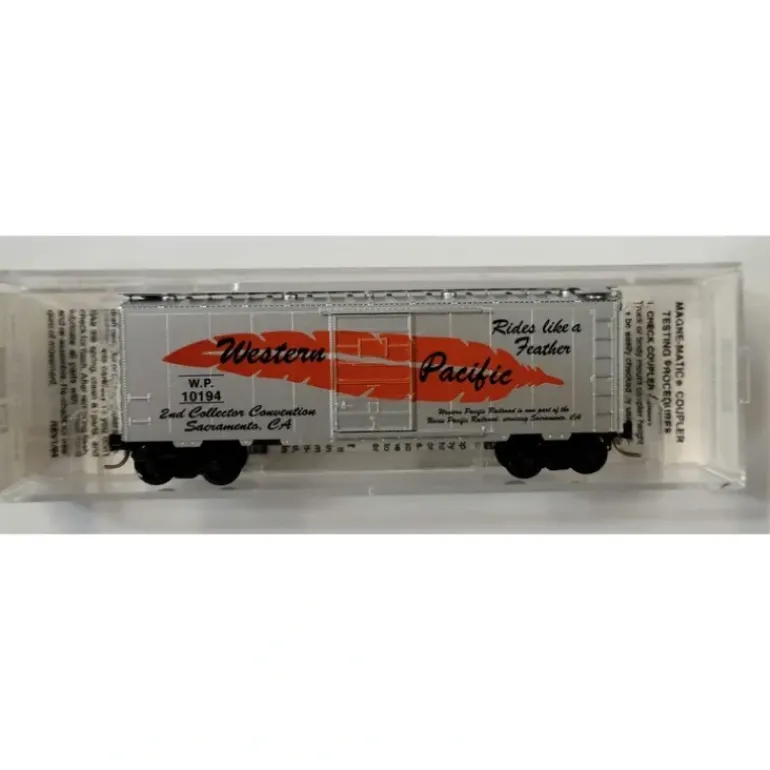This is a Micro-Trains N Scale SpecialRun Western Pacific Box Car #10194. This car features plastic construction, plastic couplers and plastic wheels.