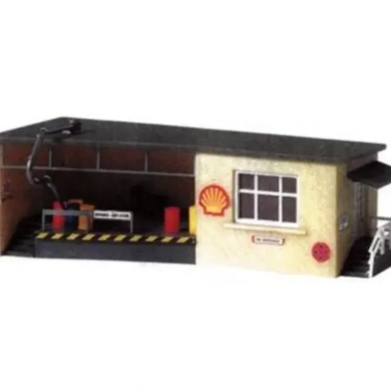 Oil Facility Office Building Kit — 3-15/16 x 1-5/16 x 1” 8.8 x 3.6 x 2.5cm – N-Scale. Features: Plastic construction (molded in five colors–tan, white, blue, light gray, and dark gray, Parts are numbered (refer to instruction sheet for parts diagram), Parts may be painted or weathered, Includes water-transfer decals (must moisten the back before applying) SHELL, Shell Emblem, Danger, Loading Ramp, No Smoking, and warning labels. Includes: One Unassembled Oil Facility Office with instructions.
