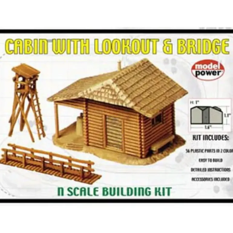 This is the N Scale Cabin with Lookout & Bridge Plastic Model Kit by Model Power. Suitable for Ages 14 & Up. Features: Durably molded polystyrene parts in 2 different colors, Easy to build, Accessories included, Detailed instructions. Includes: One Cabin with Lookout & Bridge. Requires: Assembly, Cement (HCAR3415), Hobby Knife (RMXR6909). Scale: N 1/160. Parts: 56. Length: 1.6 (40.64mm). Width: 1.1 (27.94mm). Height: 1 (25.4mm).