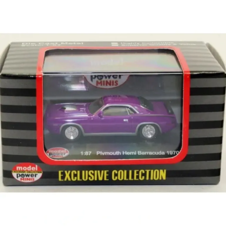 Features: Highly detailed metal 1970 Purple Plymouth Hemi Barracuda car, All new tooling, Fully painted, Heavy die-cast, Rubber tires and accurate wheels, Separately applied details, Includes display case. Includes One die cast model. Scale: 1/87.