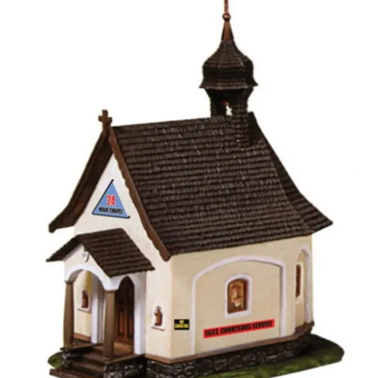 This is the HO Scale 24 Hour Chapel Built-Up from Model Power. Suitable for Ages 14 & Older. Features: The 24 Hour Chapel is completely built-up in multi-colored plastic parts, and fully decorated, Handpainted working figures molded in action poses, Lighted, Realistically molded details. Includes: One 24 Hour Chapel with two figures. Requires: Wiring to layout. Scale: HO 1/87.