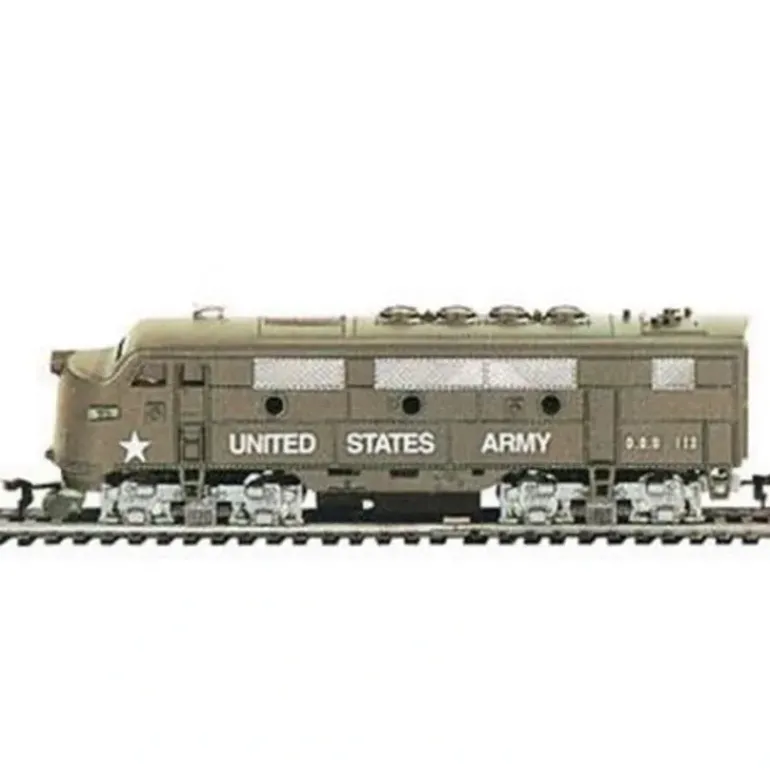 This is Model Power’s HO Scale United States Army F-2A Diesel Powered Locomotive. For train collectors age 8 and over. Features: Compatible with any HO scale railroad equipment, Metal chassis, Has 8 wheel drive and pick up, Metal wheels with gray front and rear trucks, Detailed molded features give an authentic appearance, This Army locomotive is painted the traditional Army green color, Lettering and stars are painted white, Vent-like sections, on the sides, are painted silver, Locomotive road number is D.O.D. 113, Locomotive comes packaged in a molded plastic tray, view through a windowed cardboard box. Includes: One US Army F-2A Diesel Powered Locomotive. Requires: HO Scale Electric Train Track, Maintenance Equipment, Adult Supervision. Scale: HO 1:87. Length: 7 (17.8cm). Width: 1-1/4 (3.5cm). Height: 2 (5.4cm). Comments: Keep small parts away from children age 3 and under.