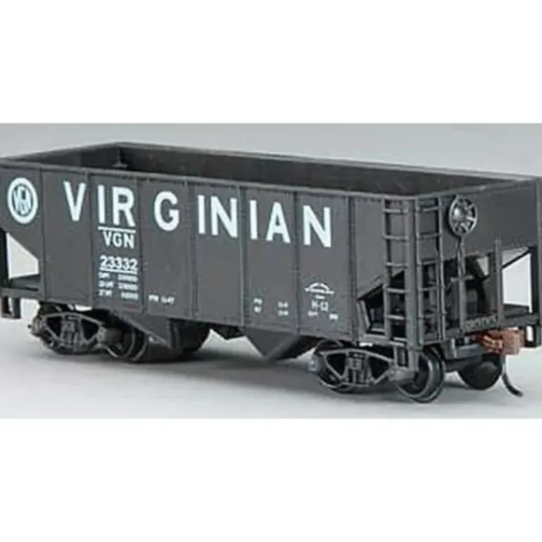 This is the HO Scale Ready-to-Run Virginian 2-Bay Covered Hopper with Knuckle Couplers from Model Power. Suitable for Ages 14 & Up. Features: Knuckle coupler equipped, Black plastic wheels, Couplers mounted to the trucks. Scale: HO 1/87. Length: 4-7/8 (123.82mm).