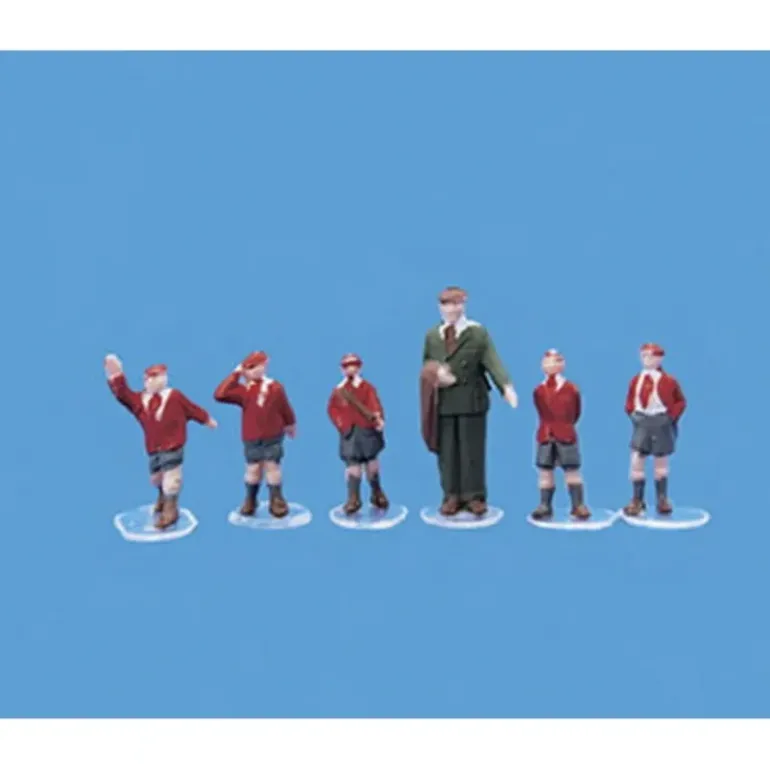 Schoolboys & Master. H0 Scale Modelscene Figures & Accessories are fully colored / painted and ready to use. The Modelscene range of accessories offers superb value for money, especially considering that they generally come pre-painted. A good option for youngsters as they often incorporate legs or feet for mounting to a layout. For more advanced modellers they offer a good starting point for repaints & customising.