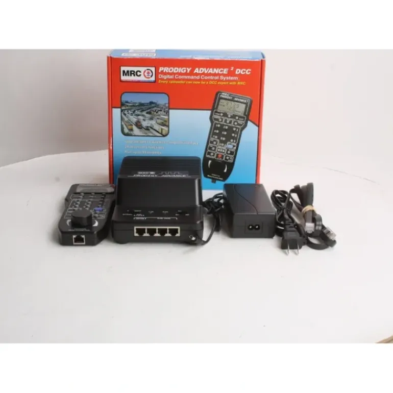 This is an MRC 0001414 All Scales Prodigy Advance Squared DCC System. If you’re a multi-user, multi-cab club with a complex layout and you’re ready to take advantage of everything the ultimate DCC experience can offer, Prodigy Advance2 is the system for you. It is also the first DCC system so brilliantly designed that it eliminates the complexities of operation without sacrificing sophisticated technology and comprehensive features., Prodigy Advance2 features: 3.5+ Amps of Power, 28 Accessory Functions, Program all CV’s, Two or Four digit addressing (0-9999 addresses available), Advanced and Universal consisting, Simultaneously run multiple throttles, Program CV’s on the main, Program on the main or on the program track, Recall and stack features, Decoder Read back, Set handheld for yard mode or mainline mode, Turnout Routing, Accessory button, Fast Clock with adjustable ratios, Handheld with: Back lit display, Console with: Three throttle plugs, Easily Upgradeable to any future NMRA protocols, Computer Interface adaptable, Available with wireless., Capable of using Wi Throttle for iPhone to turn your phone into a wireless handheld., Software is factory upgradeable, So simple, Instructions are printed on the back of the handheld., Capable of working with JMRI software., When you’re ready, you can upgrade to Prodigy Advance2 wireless DCC… all you need is MRC’s Wireless Conversion Set (0001412).