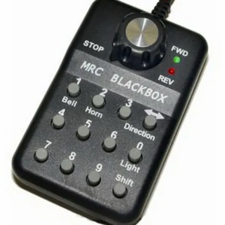 This is an MRC 1050 All Scales Railroad Sound Accessories for DC Blackbox Control Unit. DC users .. unlock the magic in your sound-equipped locomotives. No need for a sound activation box from every locomotive manufacturer. Works with an NMRA-compatible dual-mode decoder-equipped loco. Simple hookup between your power pack and track. Handheld unit lets you control speed, direction and all accessory sound functions available in the locomotive. 1.5 amp capacity.