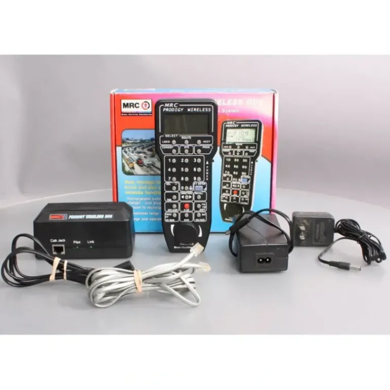 This is an MRC 1410 All Scales Prodigy Wireless DCC System. Contains power supply, base unit with built-in receiver, handheld wireless (RF) transmitter. All the newest NMRA functions up to F28. Duplex radio complete DCC system lets you program, acquire and run locos without a tethered throttle. Use multiple RF handhelds with three additional plugs for tethered throttles. Completely upgraded and upgradeable.