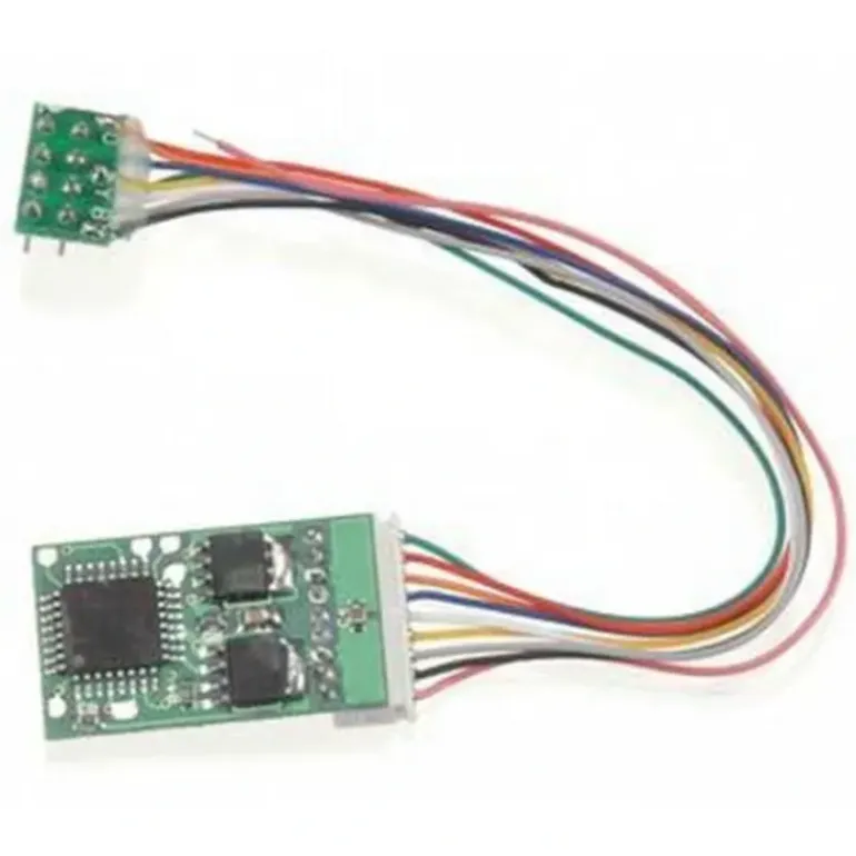 This is an MRC 1651 HO Scale DCC (Digital Command Control) Motor Control Decoder Universal w/9-Pin JST & NMRA 8-Pin Connectors. Two or four digit addressing, programming on the main, four accessory functions. With 9-pin JST connection and NMRA 8-pin harness.