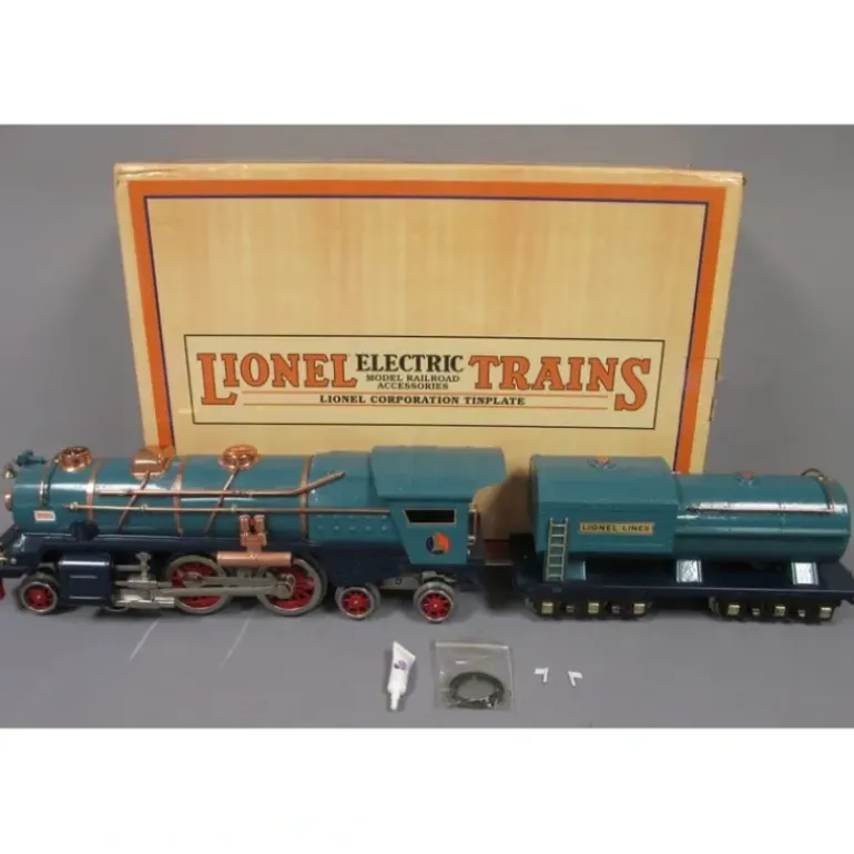 Here is a MTH 11-1009-1 Std. Gauge Lionel Lines 400E Steam Locomotive & Tender w/Proto-Sound 2.0. This is made by MTH and is part of the new “Lionel Corporation Tinplate” Line. Features include Baked Enamel Finish. Colorful Paint Scheme. Metal Wheels and Axles. Operating Metal Latch Couplers. Constant Voltage Headlight. Precision Pittmanr Flywheel Equipped Motor. Metal Handrails and Decorative Bell. Nickel Trim. Locomotive Speed Control In Scale MPH Increments. Synchronized Puffing ProtoSmoker System. Stamped Steel Boiler. Die-Cast Tender Body. Die-Cast Metal Chassis. Proto-Sound 2.0 With The Digital Command System Featuring: Freight Yard Proto-Effects. Unit Measures:32 1/2 x 4 1/4 x 5 3/4. Operates On STD-42 Curves.
