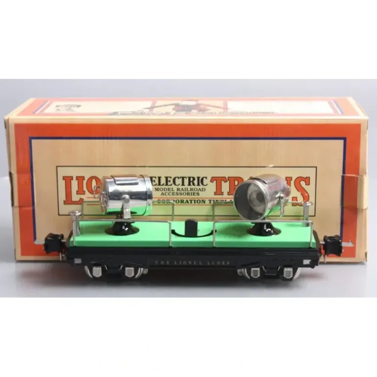Here is an MTH 11-70033 O Gauge No. 2820 Light Green Floodlight Car. This is made by MTH and is part of the new “Lionel Corporation Tinplate” Line. The features of this item are Baked Enamel Finish, Stamped Steel Body and Chassis, Metal Wheels and Axles, Operating Metal Latch Couplers, Operating Search Ligh, Unit Measures:11 x 3 1/2 x 2 5/8, Operates On O-31 Curve