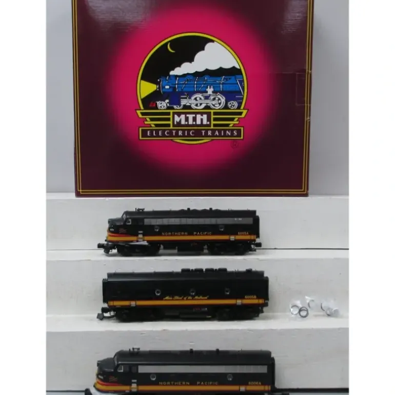 Here is an MTH 20-20045-1 Northern Pacific F-3 ABA Diesel Set w/ProtoSound 2.0. This set features directionally controlled headlights, intricately detailed ABS bodies, metal wheels, metal axels, metal gears, two remotely controlled ProtoCouplers, a colorful paint scheme, metal chassis, metal handrails, decorative horns, two precision flywheel equipped motors in each A unit, locomotive speed control in scale MPH increments, lighted cab interiors, illuminated number boards, lighted front marker lights, lighted rear marker lights, two engineer cab figures in each A unit, spinning roof fans, metal body side grilles, two operating smoke units, and it operates on O-31 curves.