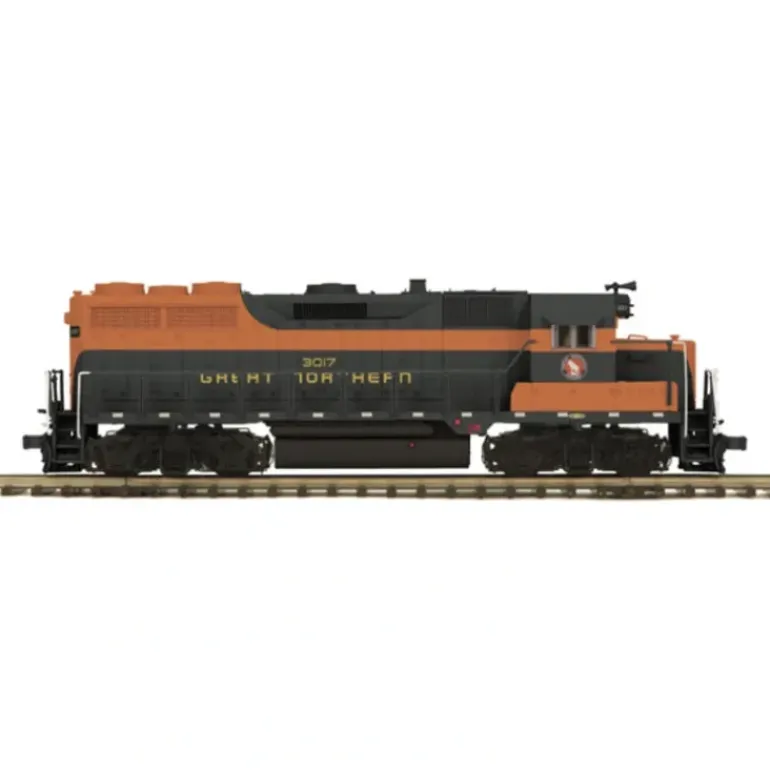 This is an MTH 20-2902-1 Great Northern GP-35 Diesel Engine w/PS2 (Hi-Rail Wheels) V2. Produced from 1963 to 1966, the GP35, along with its six-axle SD35 sibling, marked both an end and a beginning. They were the last road diesels to use the EMD 567 motor that had powered switchers, F-units, and Geeps since 1939 (so named because each cylinder displaced 567 cubic inches). For the horsepower race of the 1960s, EMD tweaked the 567 to a turbocharged V-16 delivering 2500 hp. That was it for the 567, however, and in 1966 the baton was passed to the more powerful model 645. But while the 35 line diesels ushered out an old motor, they inaugurated a new look. Their angled cab roofs and the clean, squared-off lines of their car bodies established the look of EMD power for the next three decades.